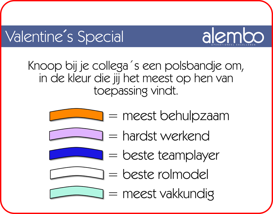 ‘We hadden op Valentijnsdag gekozen voor love & waardering als thema. Daarvoor hadden we armbandjes in verschillende kleuren gemaakt met een briefje erbij met teksten als ‘Ik vind je een hardwerkende collega’, ik vind je een plezierige collega, etc , en zo’n bandje kon je dan met de tekst aan een collega geven. Dat had een geweldig effect. De bandjes waren snel op en we hebben dan ook direct nieuwe gekocht. Het effect was dat mensen de hele dag door bandjes met waarderende teksten aan het uitdelen waren, dat medewerkers met veel bandjes om hun pols naar huis gingen en dat er heel veel foto’s werden gemaakt.’